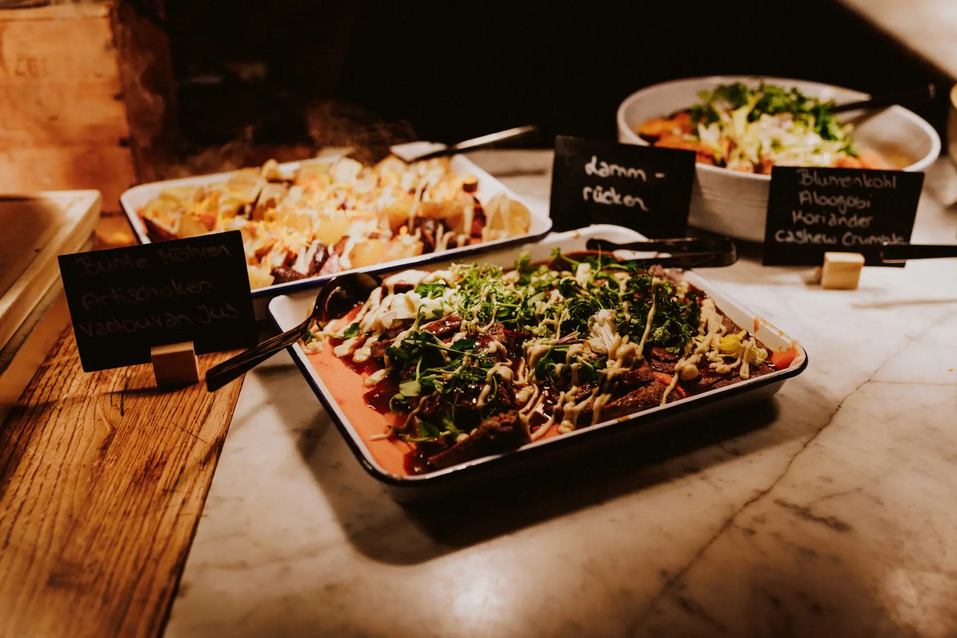 Von 3-Gänge-Menüs bis zu 7-Gänge-Degustationen – unser Catering passt sich eurem Geschmack an. Sharing-Konzepte fördern das gesellige Miteinander, während klassische Menüs jeden Gang zu einem Highlight machen. Auch vegane Optionen und individuelle Sonderwünsche setzen wir um. Die Qualität der Speisen und Getränke ist für uns genauso wichtig wie der aufmerksame Service, der eure Gäste verwöhnt. Die Menügestaltung entwickeln wir gemeinsam mit euch, damit jeder Bissen zu eurem Konzept passt.